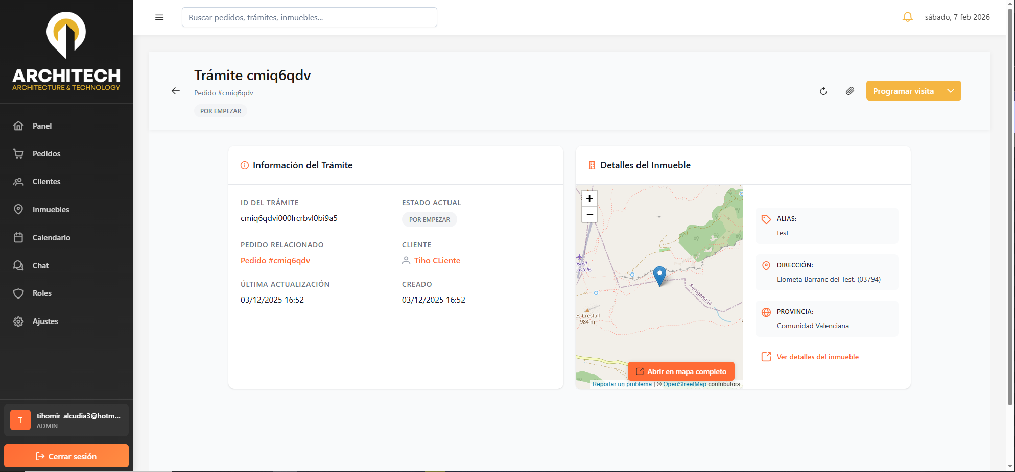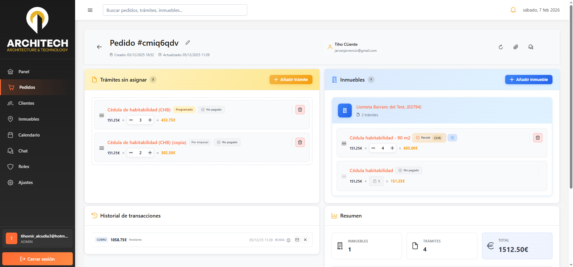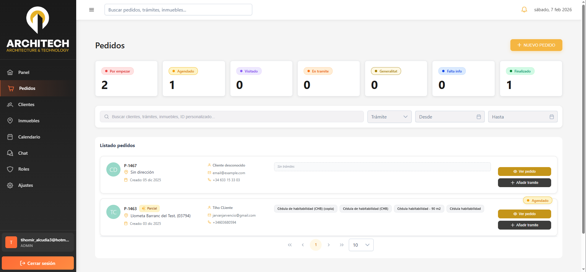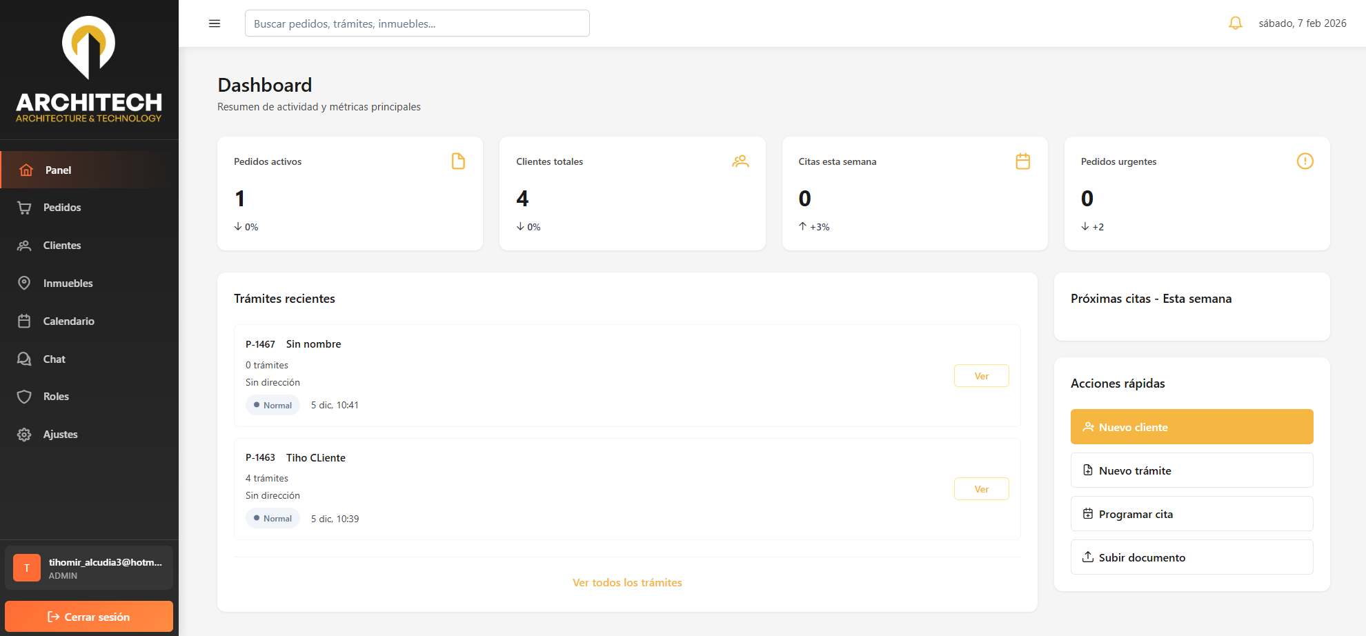 ArchiTech Intranet is a complete management system developed for ArchiTech Europe S.L., an architecture firm in Rubí, Barcelona. The platform digitizes and automates the comprehensive management of architectural procedures, from order capture to final delivery.