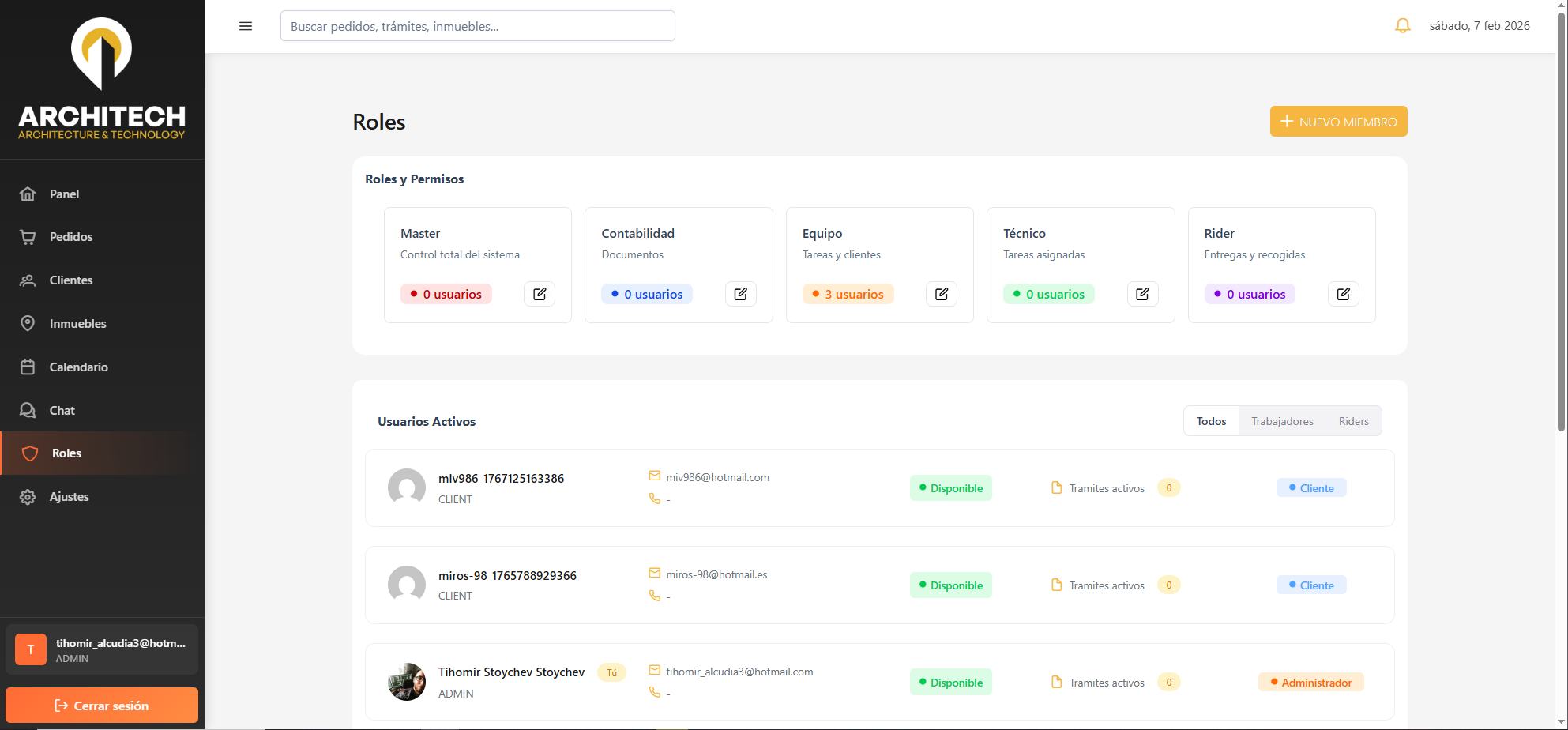 Granular permission management with differentiated roles (ADMIN, RIDER, CLIENT, MASTER, CONTABILIDAD, EQUIPO, TECNICO) and views adapted to each user type.